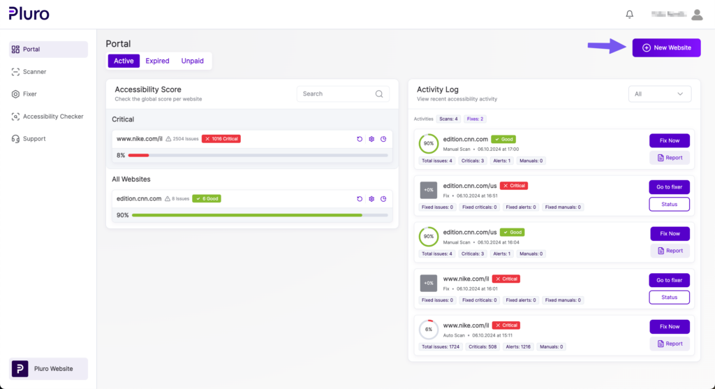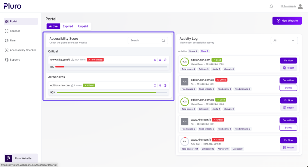 The Pluro Portal is your central hub for managing website accessibility. From this screen, you can easily track your websites’ accessibility scores, view recent activity, and take action on any critical issues. Here’s a breakdown of how to navigate and use the portal effectively.