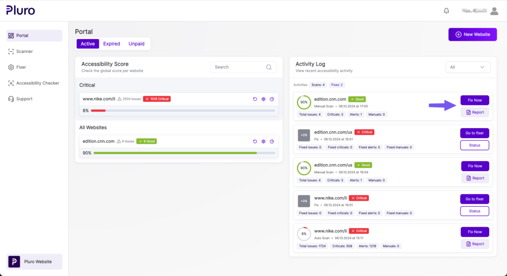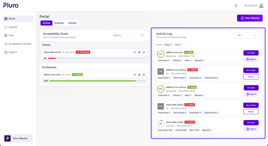 The Pluro Portal provides an at-a-glance view of your entire website accessibility landscape. With real-time data, activity tracking, and quick access to fixing tools, you can ensure that your sites are continuously monitored and fully accessible.
