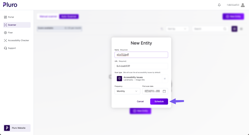 Automating accessibility scans in Pluro ensures that your website is regularly checked for compliance without manual intervention. By scheduling scans for different parts of your site, you can continuously monitor accessibility and address issues as they arise. Follow the steps below to schedule an automated scan for any part of your website.